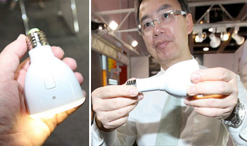 4 W LED bulb with a rechargeable battery inside works up to 3 hours after a power outage offered by Magic Bulb for $30-$40.https://zmi.led-professional.com/Plone/media/project_news_lamps-luminaires_recharable-led-bulb_rechargeable-led-bulb-jpg/viewhttps://zmi.led-professional.com/Plone/media/project_news_lamps-luminaires_recharable-led-bulb_rechargeable-led-bulb-jpg/@@images/image-1200-0812bd435810c1fbe67caa4a15fca356.jpeg