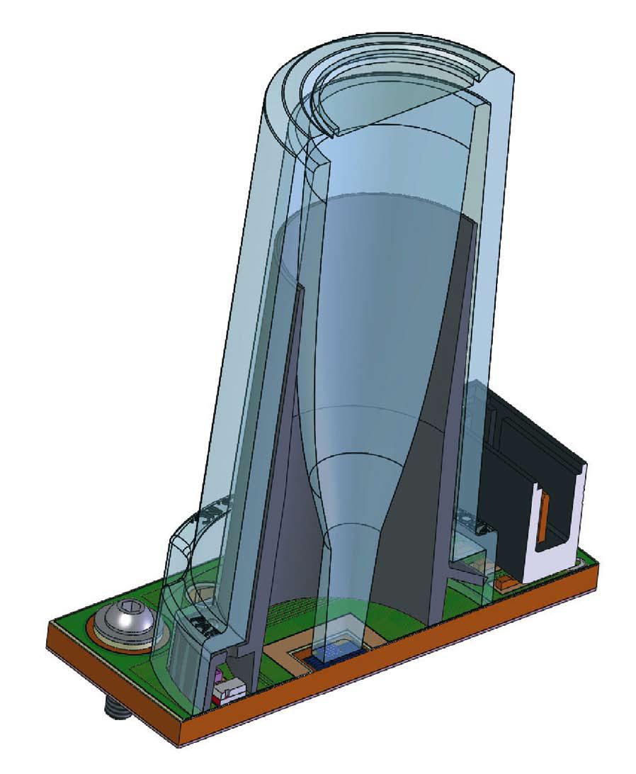 Figure 2: A rendered cross sectional view of a LumiBright LE light engine is shown. The light enters the primary collection optic aperture which is positioned just above the LED die array.https://zmi.led-professional.com/Plone/media/resources-1_articles_primary-and-secondary-optic-materials-led-luminaire-performance-and-lifetime_optics2-jpg/viewhttps://zmi.led-professional.com/Plone/media/resources-1_articles_primary-and-secondary-optic-materials-led-luminaire-performance-and-lifetime_optics2-jpg/@@images/image-1200-bf83118871050bd3ac50540c9242de02.jpeg