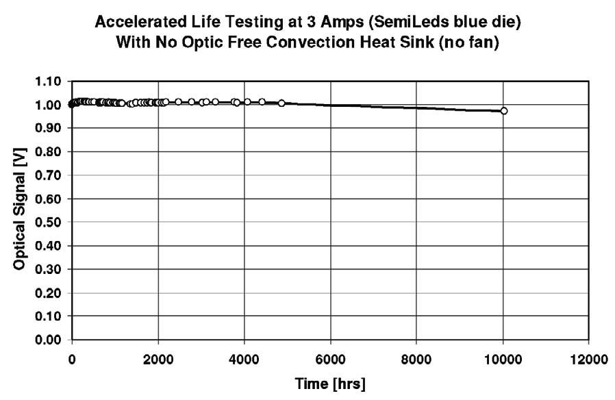 Figure 3: The intensity versus time is shown for a single blue LED die from SemiLEDS operated at a current density of 850 % nominal indicating how far LED die technology has progressed.