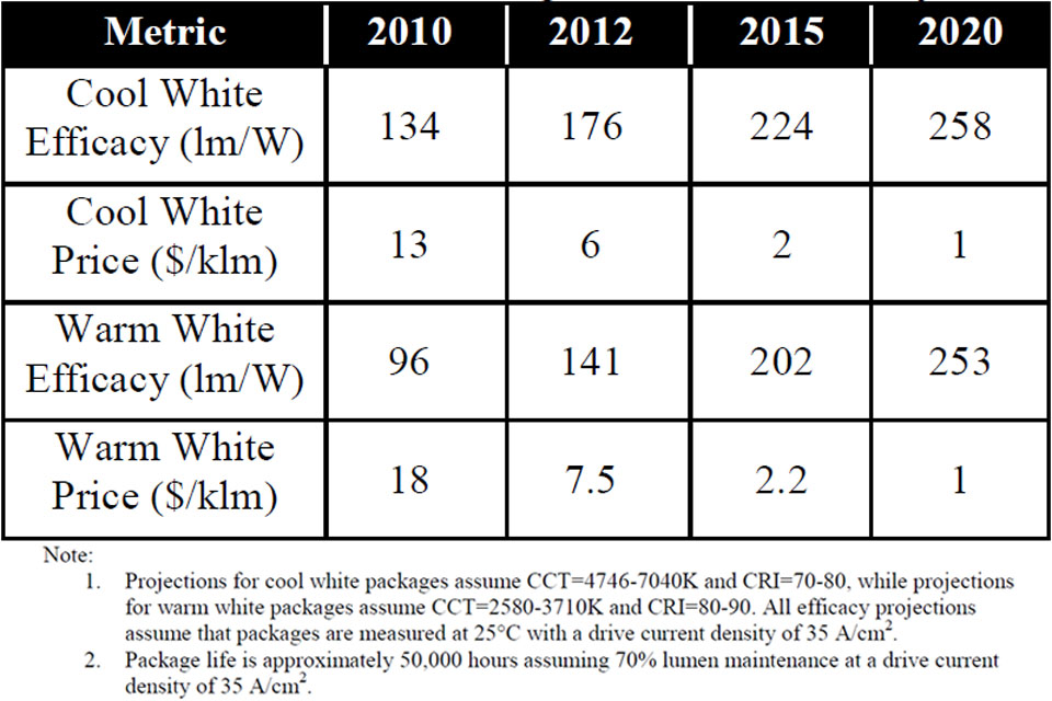 Several informative charts and tables are part of this DoE report, like the "summary of LED package price and performance projections"