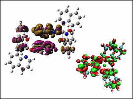 In a device such as an optical display, positive (purple) and negative (gold) charges are attracted strongly to one another and become trapped (first picture). Because of the unusual rules of quantum physics, the trapped charges can emit light (second picture) if they are spinning in opposite directions. Van Voorhis is creating simulations to show how to selectively create trapped charges in organic light-emitting diode displays to improve efficiency. Image courtesy / Troy Van Voorhis