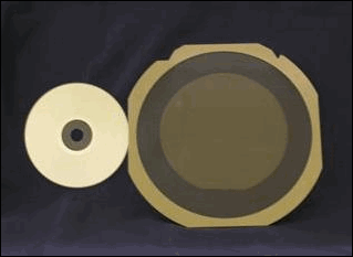 LED chip made using four-inch sapphire substrate (On the left: A 12-cm CD for size comparison)