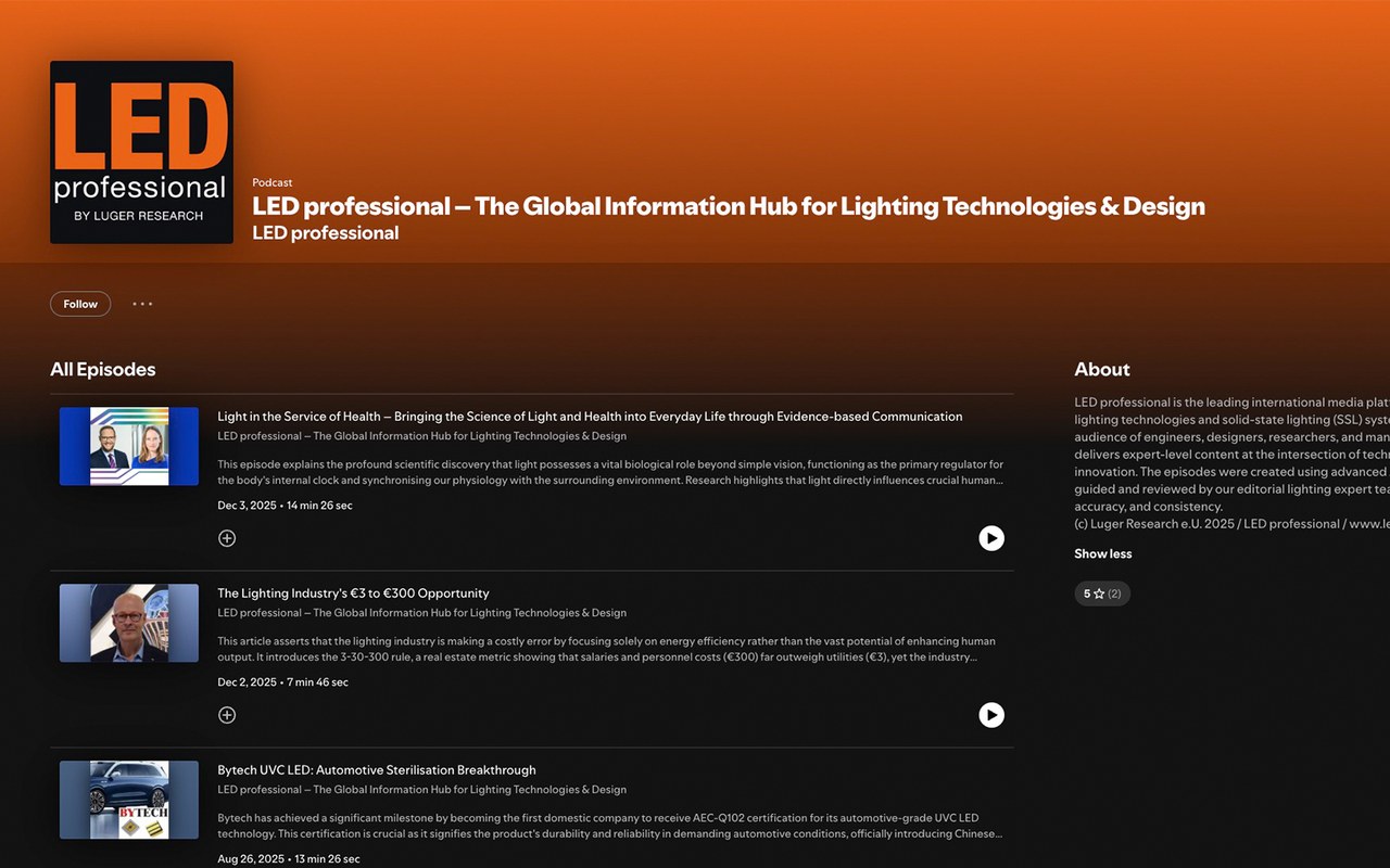 The LED professional Podcast brings you expert insights into LED and lighting technologies, industry trends, applications, and design. Featuring interviews with leading experts, researchers, and decision-makers, the podcast explores innovations shaping the global lighting industry.